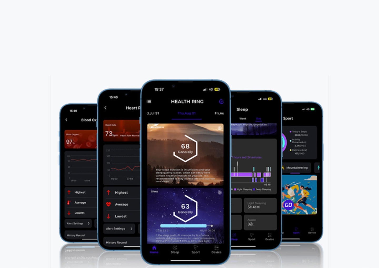 Dzięki wbudowanym czujnikom pierścień automatycznie mierzy saturację krwi. Dane są prezentowane w formie wykresów dziennych, tygodniowych i miesięcznych – możesz w prosty sposób śledzić trendy i szybciej reagować na spadki energii.